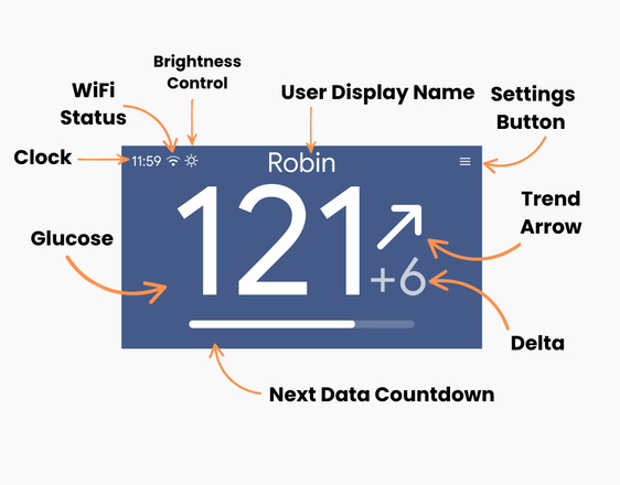 The sugardash main screen shows your WiFi signal, time, and user name, with a button for settings and brightness control. It displays your current glucose, a trend arrow from your CGM, and the delta, which is the change from your last reading. A countdown bar lets you know exactly how long until the next glucose update is expected.