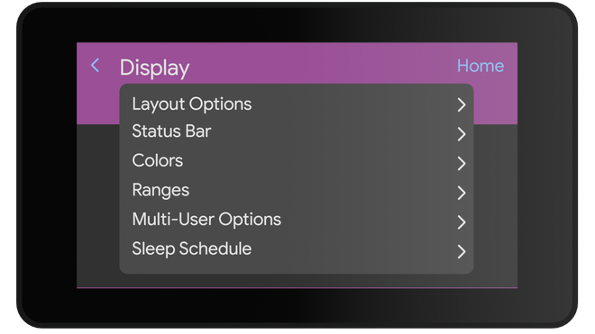 This menu includes settings to control Layout options, colors, glucose thresholds, multi-user options, and more. Click the link for more information on sugardash Display settings.
