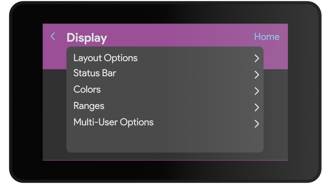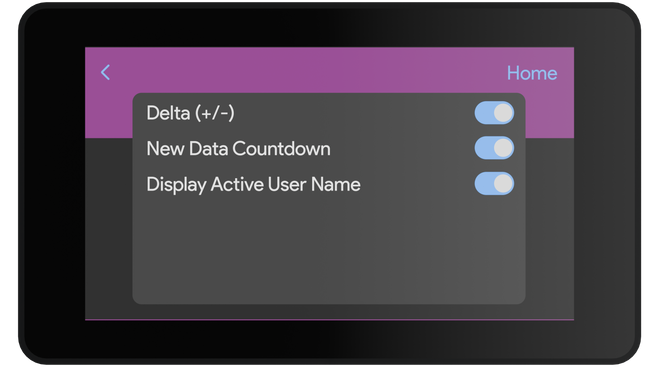 Controls what information appears on the main screen, such as Delta, Next Data Countdown, and the active user’s name.