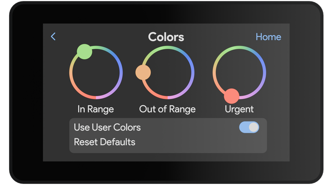 Choose background colors for in range, out of range, and urgent glucose values. You can also enable unique user colors, which assign a distinct color to each user. This is especially useful in households with multiple users, since it makes it easier to quickly tell at a glance whose data is being displayed, even from across the room.