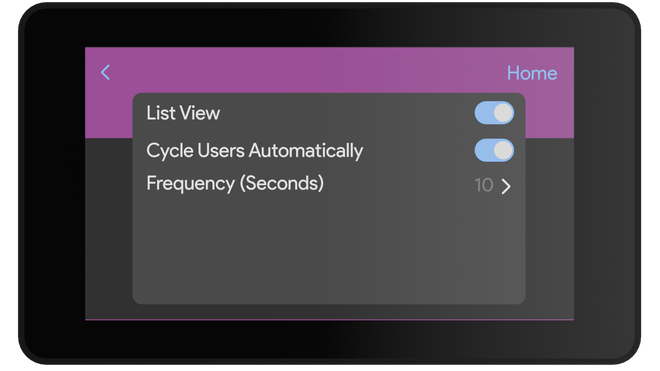 Choose how multiple users are displayed. Options include a list view to show all users at once, or automatic cycling between users. If cycling is enabled, you can adjust how many seconds each user is shown before switching.